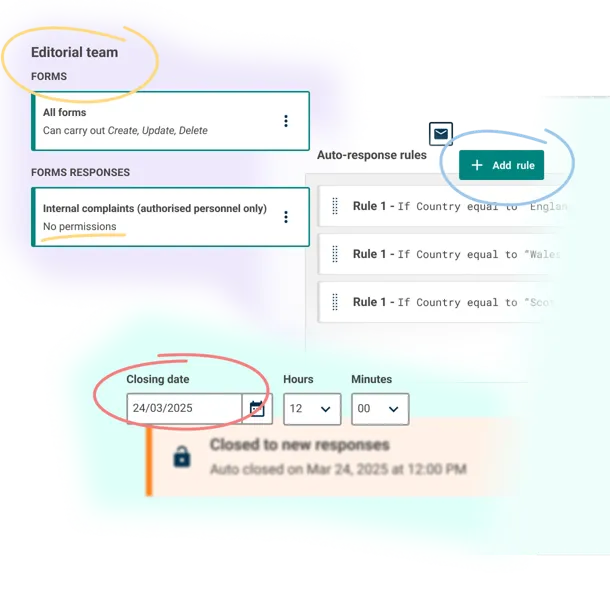 Control who can create, edit, and view forms and responses. Set permissions on a form-by-form basis to ensure sensitive information is only accessible to authorised personnel.